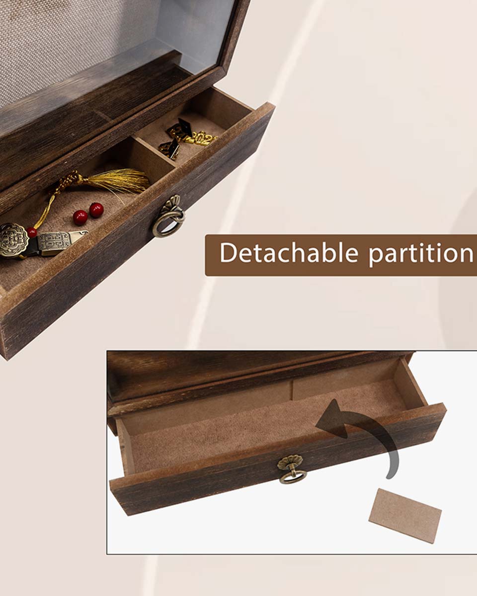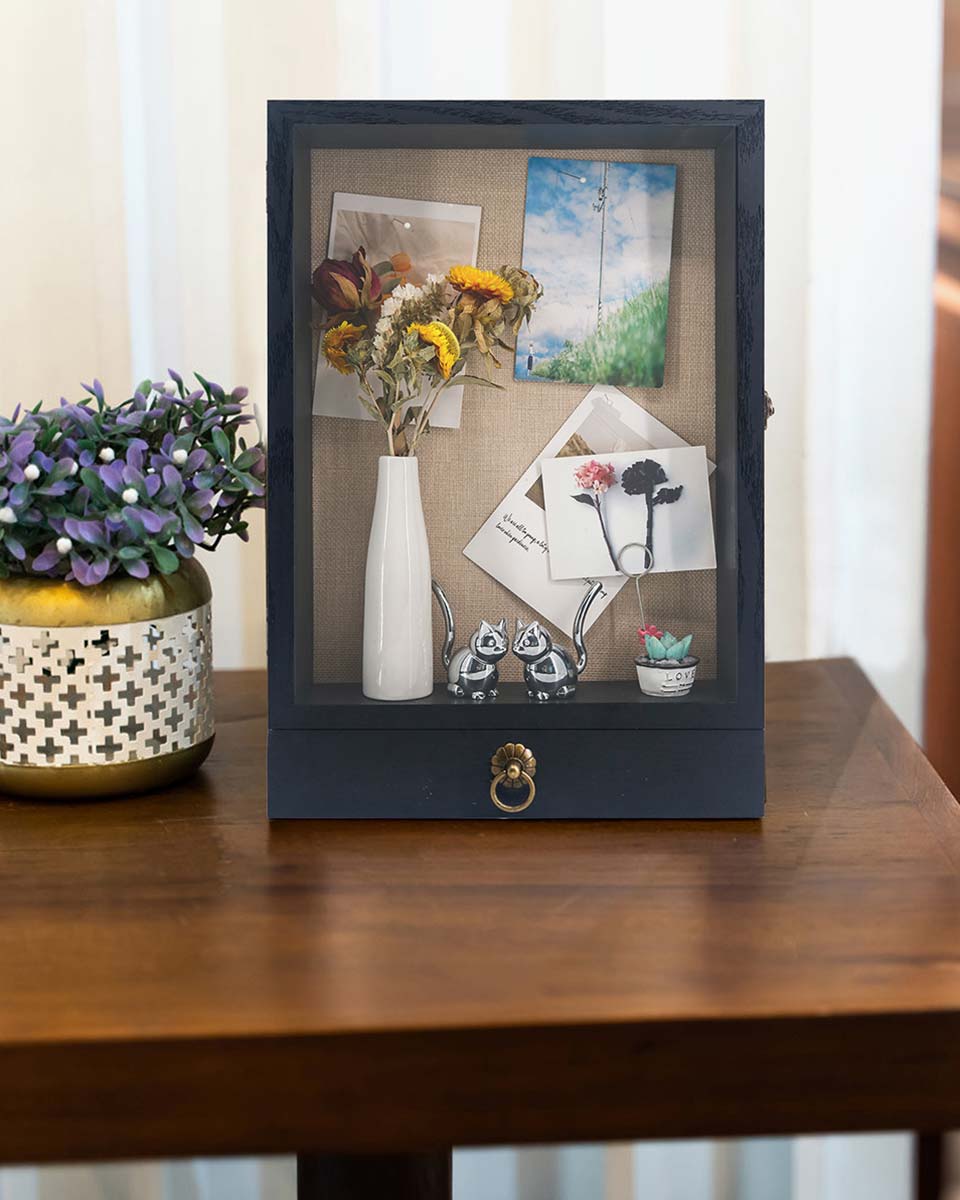 The 11” x 16” x 3'' deep depth shadow box comes with a solid, durable wood frame, woven fabric interior with 6 stick pins, has horn lock door with a REAL GLASS window, and two metal sawtooth hanging hooks on its back. The front display door makes it easy to place or exchange items inside. The retro horn lock makes the shadow box lockable and more secure and prevents the items inside from falling out. The solid wooden vintage look complements any decoration, and it has two hooks on the back for easy wall mounting. A thoughtful gift for various occasions including Mother's Day, Christmas, Thanksgiving, Anniversary, Housewarming parties, etc. Keep your precious memory, and make your memories stand out.